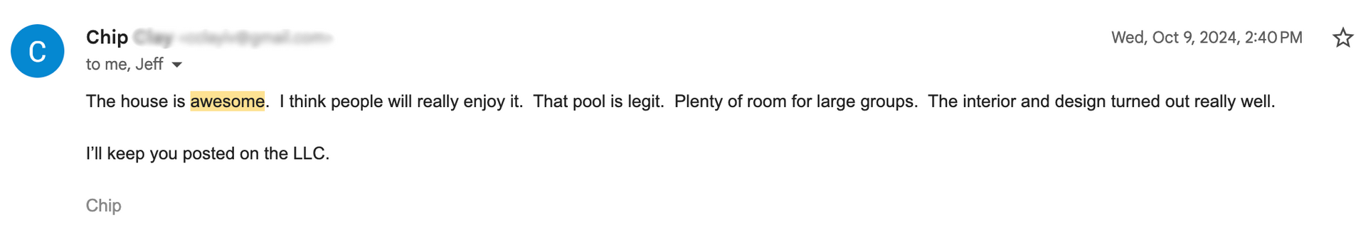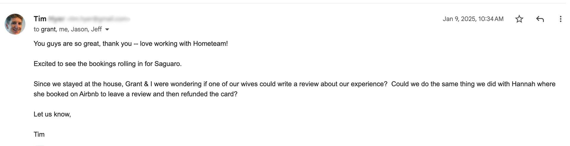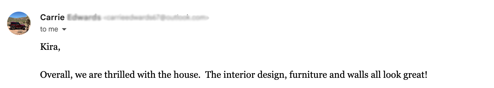 The Home Team BNB Turnkey process overall was a great experience. This being our first venture into vacation rentals, it was extremely helpful to have professionals alongside every step of the way through home selection, financing, design, ordering, rehab/proj. management, staging and ultimately posting on AirBnB. All with a local presence near our home which provided much comfort given we live multiple states away. The team worked very hard from start to finish. Even as we experienced unexpected bumps, HT always jumped in to find a solution and push forward. Overall, it was a great experience and look forward to working with everyone on the next one. Now that we’re live, the local team managing guests, bookings, cleaning, etc. have also been phenomenal to work with and are always available for our guests anytime there is a need.